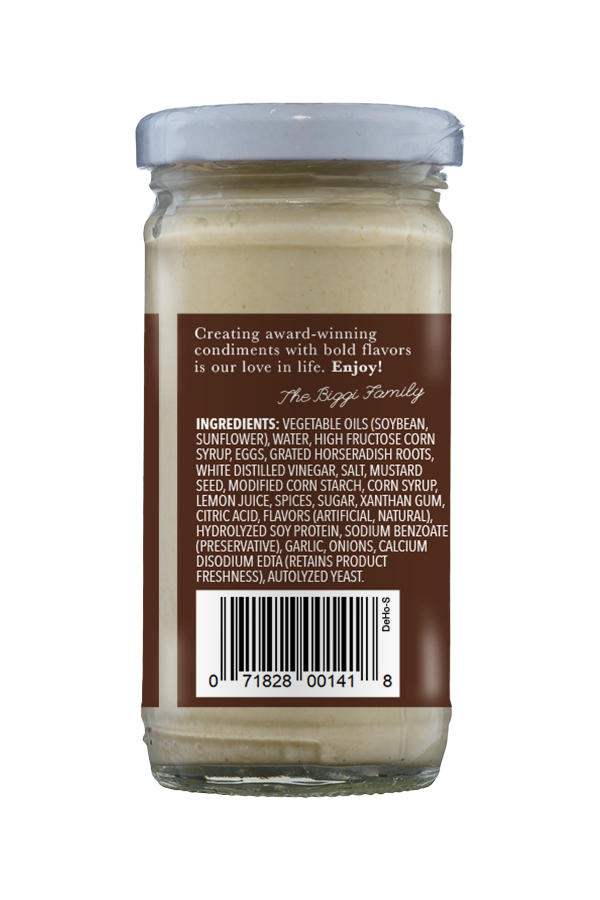Our Deli Horseradish Sauce uses 100% freshly grated horseradish roots but is much less spicy than our other horseradish blends. It’s perfect to add mild heat to any red meats or deli sandwiches without overwhelming spice.