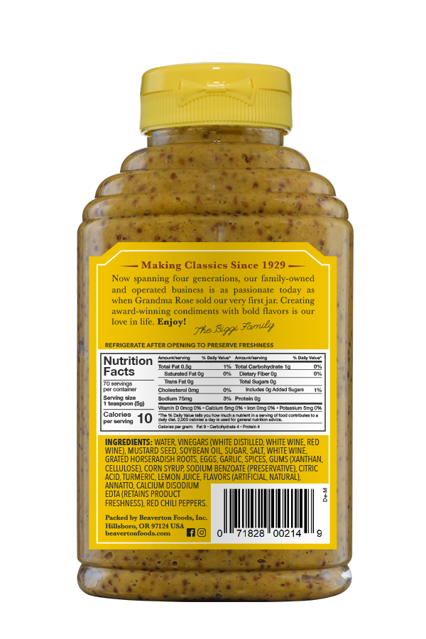 - Eden BuchananI just want to commend you on the products I am enjoying so far. Your “Stone Ground Mustard” has always been a favorite, and recently bought your Cream Style Horseradish. Now I put it on almost everything (although granola doesn’t work). Glad to see company origins 1929 and still going strong!